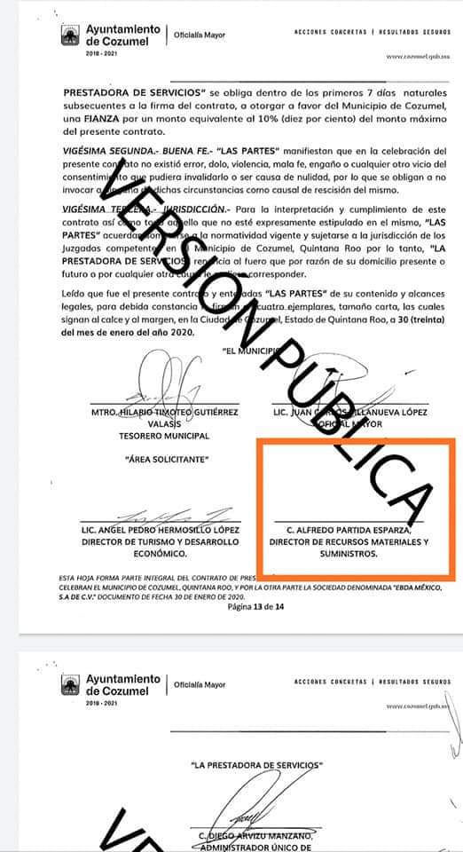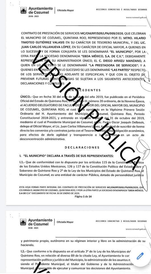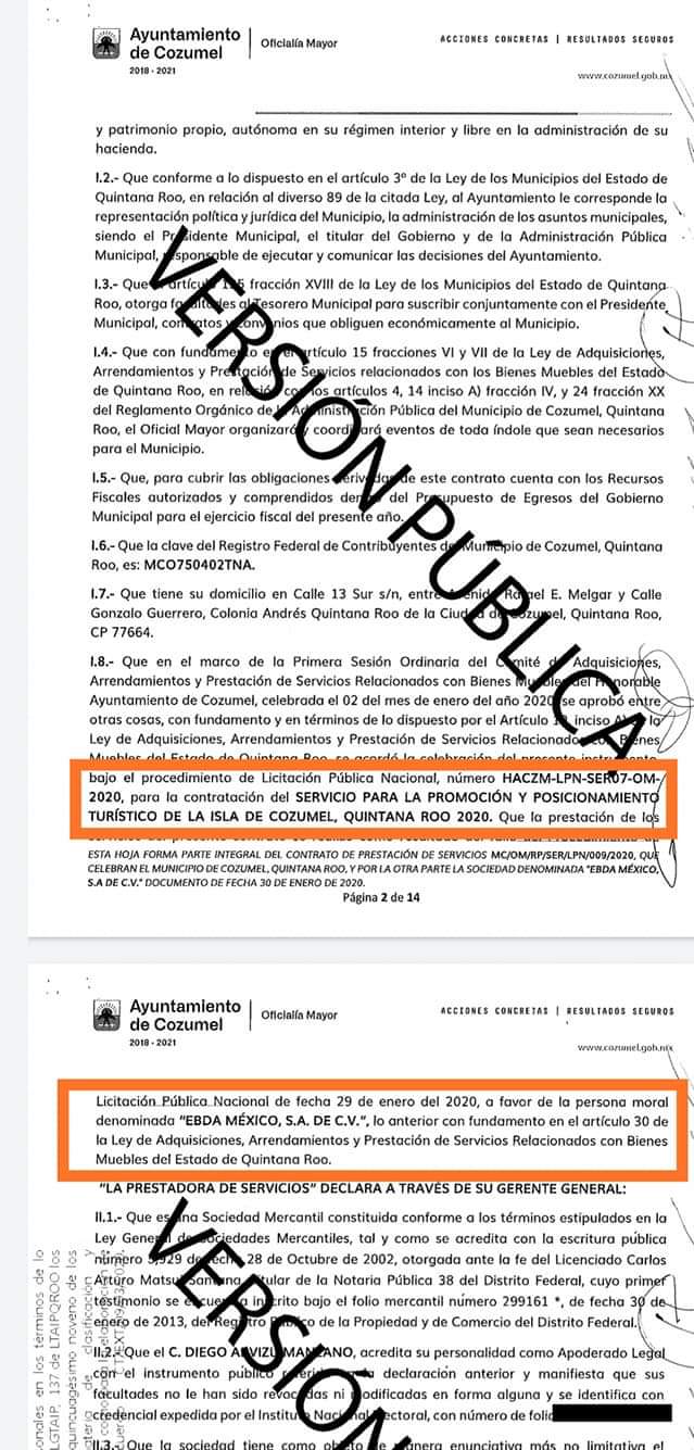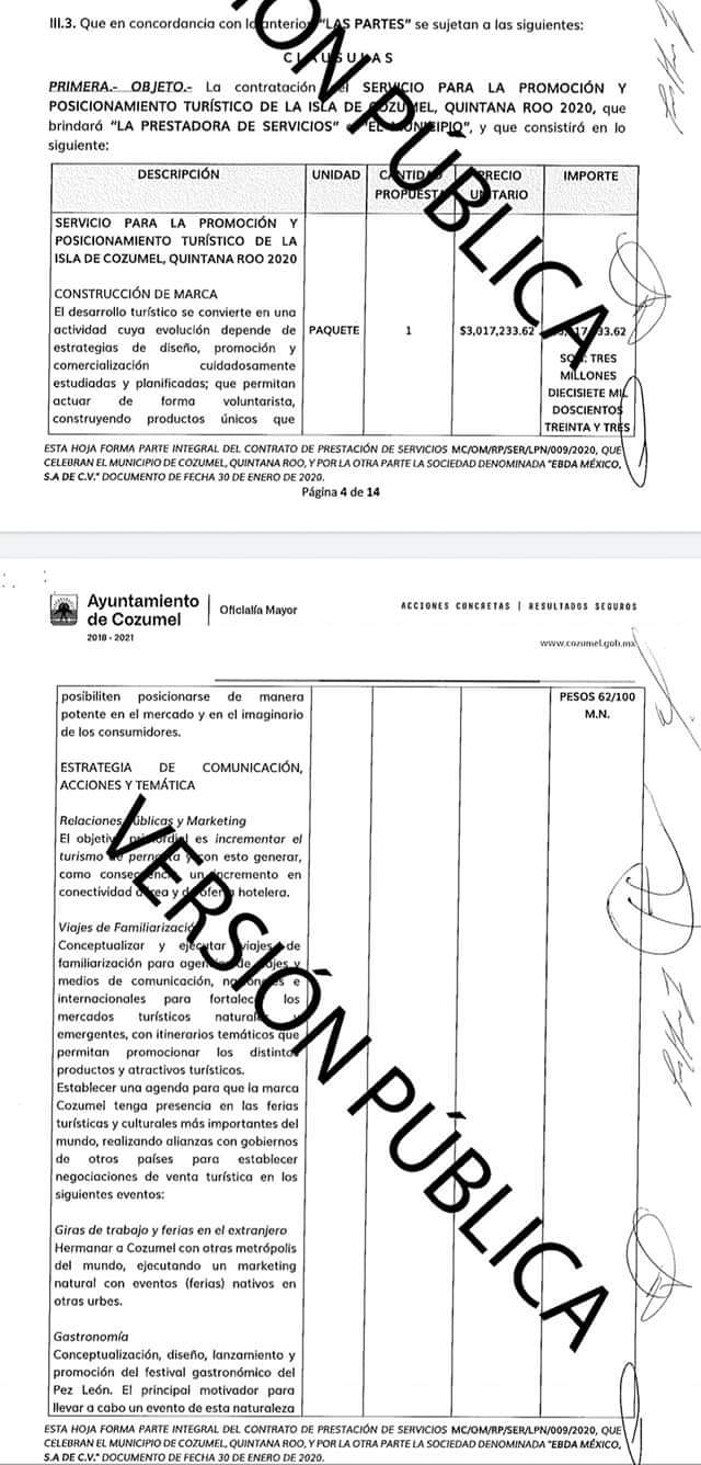 El contrato que consta en la Plataforma Nacional de Transparencia con número de contrato MC/OM/RP/SER/LPN/009/2020, quien obtuvo el trabajo fue la empresa EBDA, S.A. de C.V., para la promoción y posicionamiento turístico de la isla de Cozumel y en el cual se gastaron 3 millones 499 mil 991 pesos, que fueron pagados de forma mensual a razón de 318 mil 181 pesos, desde febrero hasta el mes de diciembre de 2020.