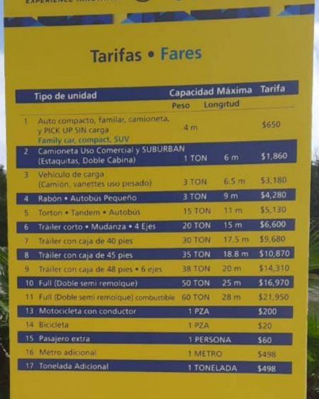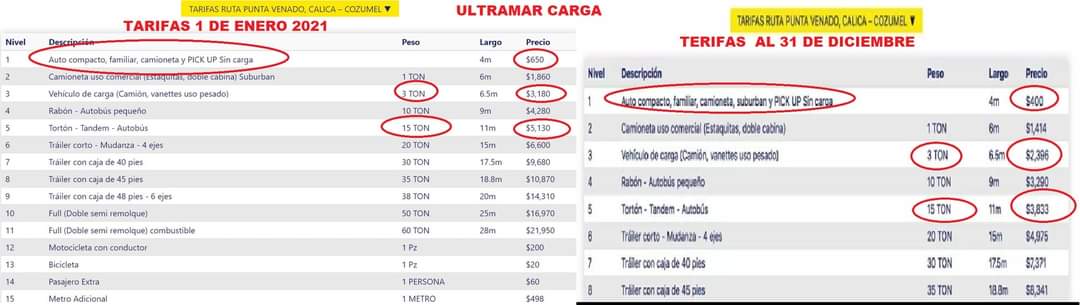 Hasta el día 31 de diciembre de 2020 la tarifa de un camión de 3 toneladas era de 2,396, este 1 de enero pagaron 3,180 pesos. Un camión de 15 toneladas pagó el 31 de diciembre 3,833 pesos, y éste 1 de enero pagó 5,130 pesos. Mientras que en los camiones más grandes las tarifas variaron más de 2,529 pesos.