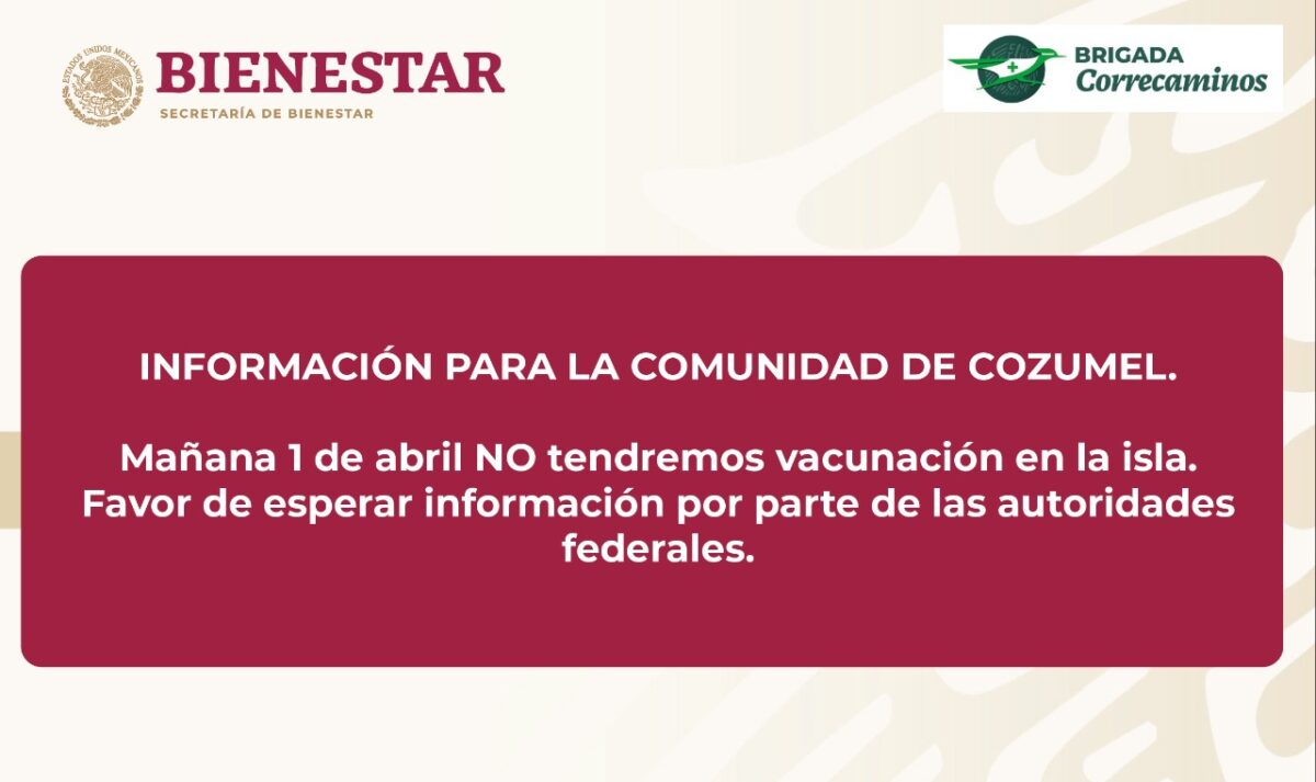 «Definitivamente no se estará vacunando mañana jueves 1 de abril, porque no ha llegado las vacunas, pero se está en espera de éstas y muy probablemente se esté programando para el fin de semana, pero aún no tenemos fecha, ni horarios de vacunación. Pedimos a la gente que se mantenga informado y no caer en publicaciones que solo buscan desinformar y crear molestia entre la ciudadanía», enfatizó la delegada de la Secretaria del Bienestar en Cozumel.