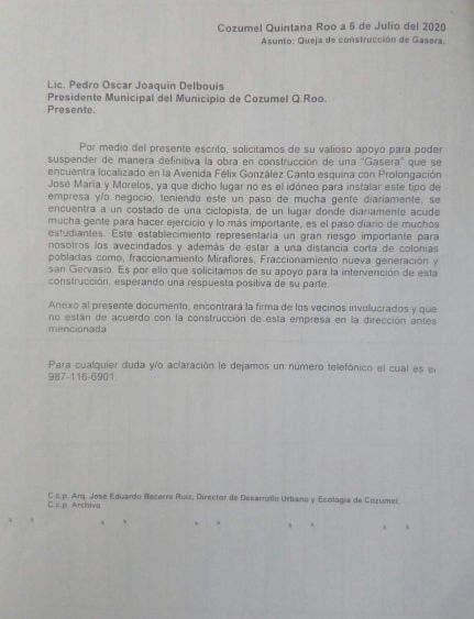 Realizaron una carta que dirigieron al presidente Municipal Pedro Joaquín, con copia al director de desarrollo urbano y ecología, José Becerra, en donde señalaban sus argumentos para no permitir la construcción.