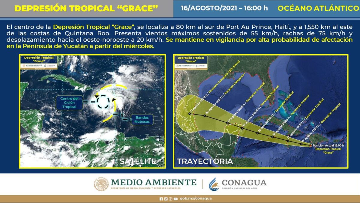 Grace se encuentra, según el ultimo reporte ofrecido por la Conagua y la Coordinación Estatal de Protección Civil de Quintana Roo, a mil 550 kilómetros de las costas de Quintana Roo, por lo cual no representa de momento peligro para el estado.