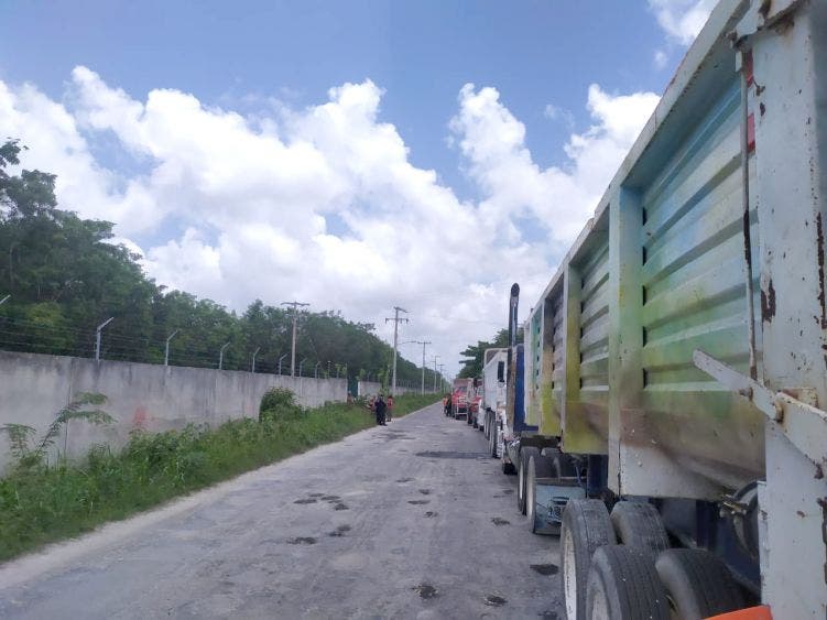 Volqueteros de Cozumel impiden laborar a similares de Cancún.- Integrantes del Sindicato de Volqueteros hicieron el bloqueo de camiones foráneos que estaban suministrando materiales pétreos dentro del Aeropuerto Internacional de Cozumel, ya que los desplazaron y les quitaron la oportunidad de obtener ingresos para las familias de la isla que han estado esperando esta oportunidad para salir de la crisis económica que les causó la pandemia Covid-19.
