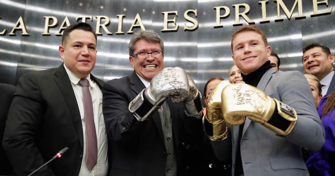 Visiblemente emocionado, Monreal se puso unos guantes color plata para la fotografía con Álvarez, con guantes dorados, en la primera aparición pública del campeón en su país, luego de haber derrotado el pasado 6 de noviembre al estadounidense Caleb Plant.
