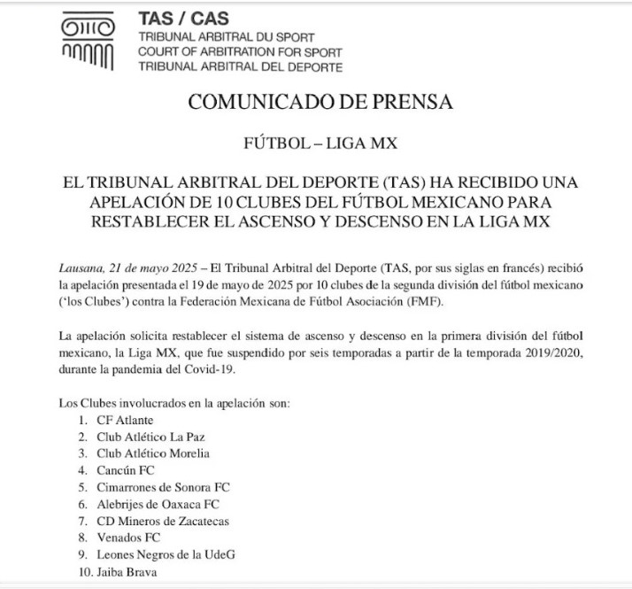 En el comunicado que los clubes compartieron se puede leer “Sobre todo, fuimos al TAS porque estamos cansados de cómo se administra el futbol mexicano. Se ha convertido en un negocio que solo favorece a los clubes de la Liga MX en detrimento de toda la cadena del futbol nacional…».