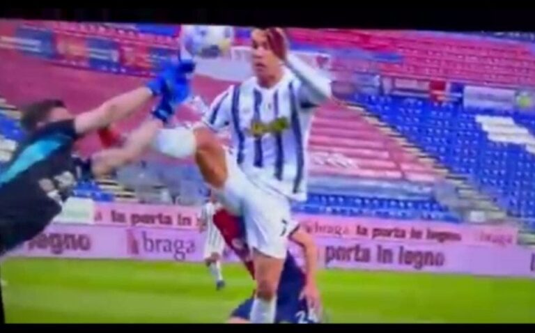 Brutal patada de Cristiano Ronaldo este domingo, que le terminó abriendo la quijada al arquero del Cagliari, en el duelo ante la Juventus por la Fecha 27 de la Serie A.