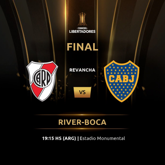 Informaron que el partido de la Final de la Copa, se jugaría a las 19:15 horas (tiempo local). Originalmente, el partido estaba programado para las 17:00 horas, sin embargo, actos de violencia y la salud de los jugadores del Boca, postergaron el encuentro para las 18:00 horas.