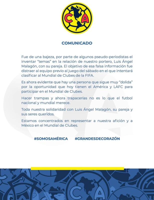 Sin que exista hasta el momento un desmentido de este hecho por parte de las autoridades, las «águilas» consideran que «hay una persona que sigue muy «dolida» por la oportunidad que hoy tienen el América y LAFC para participar en el Mundial de Clubes». por lo que agregan, «Hacer trampas y ahora trapacerías no es lo que el fútbol nacional y mundial merece».