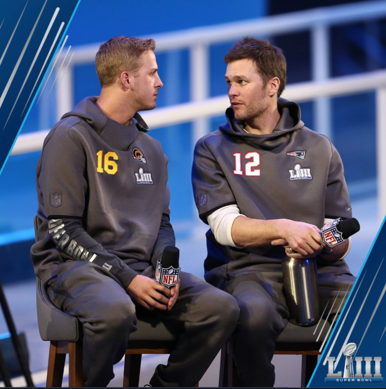 Uno de los momentos que más llamó la atención fue cuando los quarterbacks de ambos equipos subieron al estrado para contestar preguntas. Ahí, le pidieron a Tom Brady que le diera un consejo a Jared Goff.