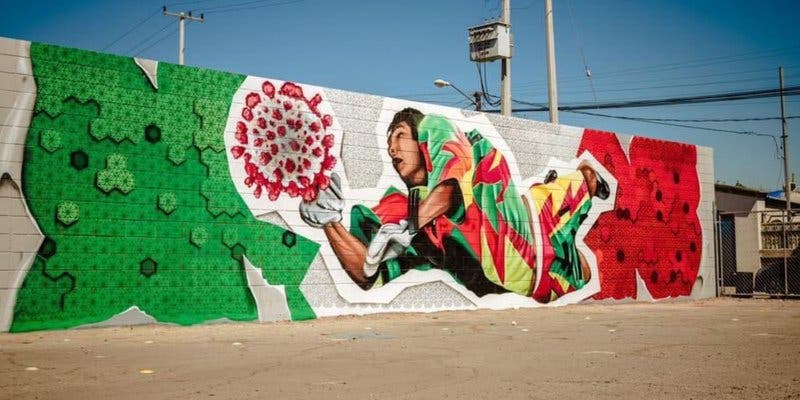 En el mural, Jorge Campos aparece con su clásico uniforme de colores de principios de los 90 en medio de una bandera con los colores de México, mientras se avienta una atajada y detiene una representación del virus.