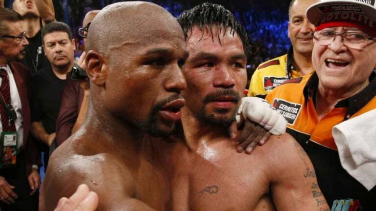 Por medio de su cuenta oficial de Twitter, Pacquiao documentó el momento en el que acercó a saludar a Floyd. El boxeador filipino pasó detrás del boxeador estadounidense, quien respondió el saludo.