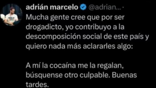 “Mucha gente cree que por ser drogadicto, yo contribuyo a la descomposición social de este país y quiero nada más aclararles algo: A mí la coc… me la regalan, búsquense otro culpable. Buenas tardes”, criticó el influencer.