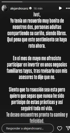 Por medio de un mensaje que compartió en sus historias de Instagram, Alejandro Sanz se defendió de las declaraciones de Ivet.
