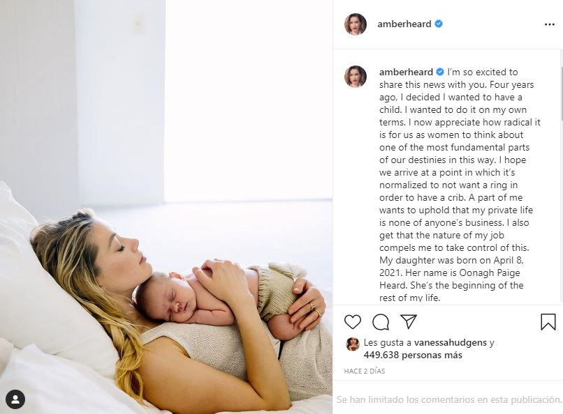 Mi hija nació el 8 de abril de 2021. Su nombre es Oonagh Paige Heard. Ella es el comienzo del resto de mi vida.