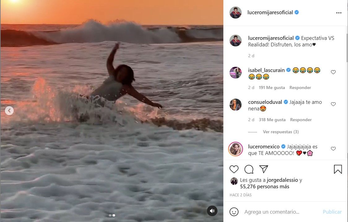 Desde su cuenta de Instagram, la joven compartió un videoclip en donde apareció en la playa, disfrutando de un paisaje paradisiaco durante un atardecer. En el clip, Lucero utilizó un traje de baño de cuerpo completo color blanco y bañándose en el mar.