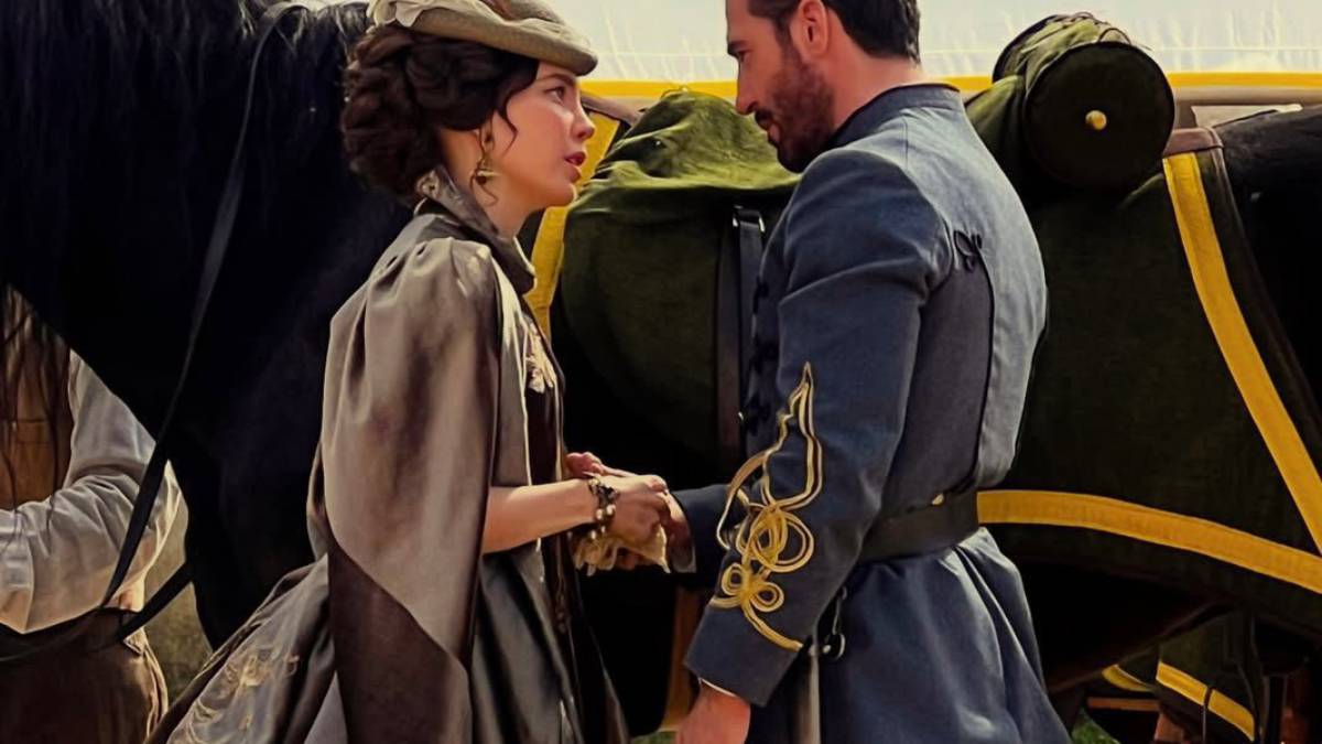 En las fotografías también aparece el actor Miguel Ángel Silvestre, con quien comparte créditos en la serie. Ambos portan vestuarios de época: Belinda con un vestido ampón en tonos ocres y el actor con uniforme militar, espada y botas, lo que ha generado gran expectativa entre el público.