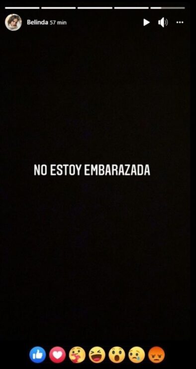 A través de Instagram, Belinda publicó una historia en donde decía «NO ESTOY EMBARAZADA», aunque una hora después de la publicación el mensaje fue borrado sin dar ninguna explicación.