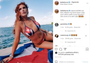 En un carrete que compartió hizo alarde de su delgada figura apenas cubierta con un traje de baño de dos piezas con el estampado de la bandera de Cuba.