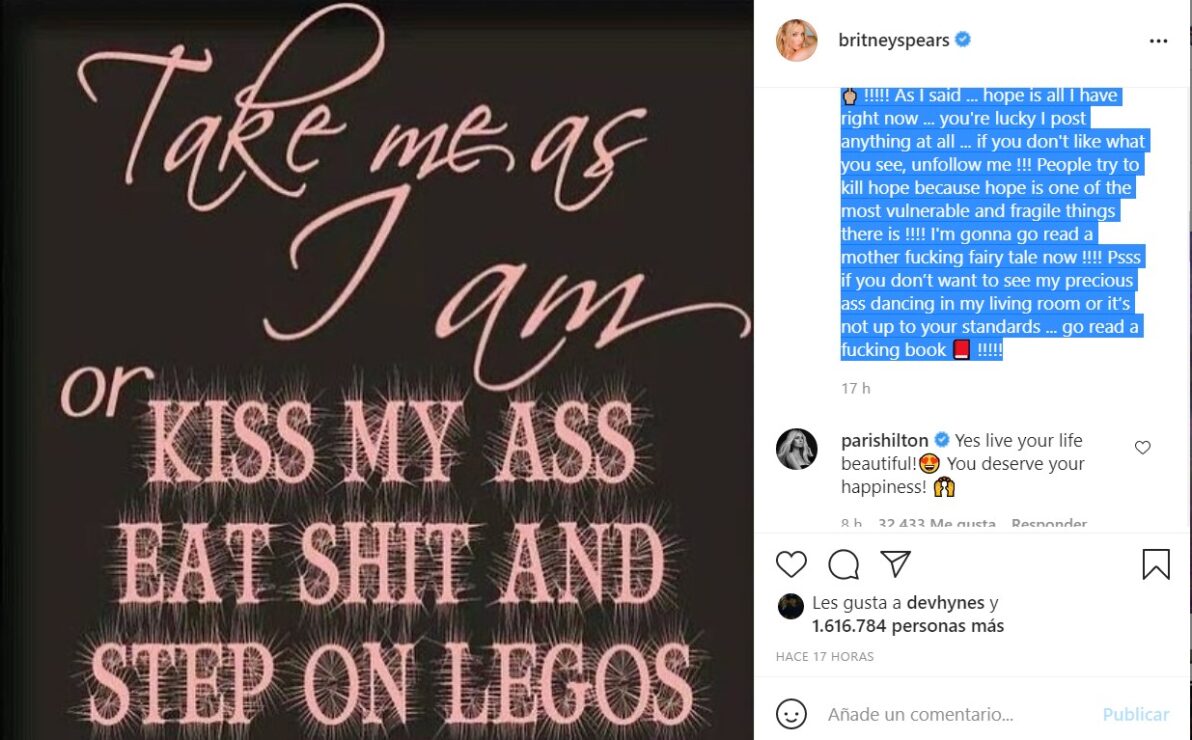 La que fuera conocida como ‘Princesa del pop’ publicó en Instagram una imagen en la que se leía el mensaje: «Acéptame por lo que soy o bésame el culo, come mierda y pisa algunos legos».