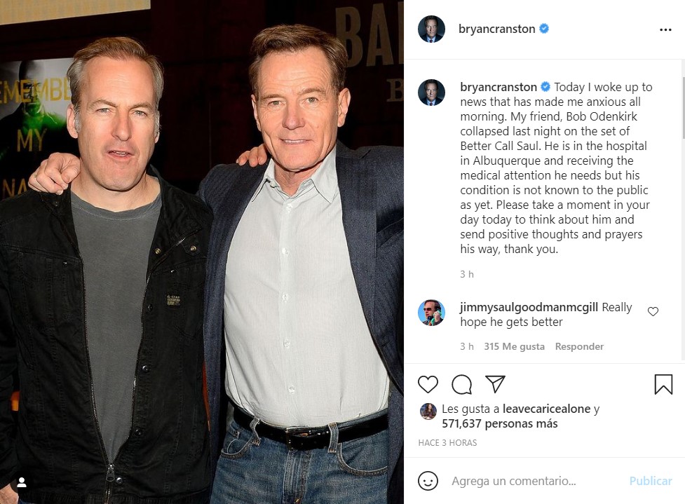“Hoy me desperté con esta noticia que me ha mantenido ansioso toda esta mañana. Mi amigo Bob Odenkirk colapsó anoche en el set de ‘Better Call Saul’. Está en el hospital de Albuquerque y recibe la atención médica que necesita, aunque su estado de salud es desconocido a nivel público. Por favor, tómense un momento en su día de hoy para pensar en él y enviarle pensamientos positivos y oraciones. Gracias”, escribió Cranston en un mensaje que publicó en su perfil de Instagram, donde compartió una imagen con el intérprete.