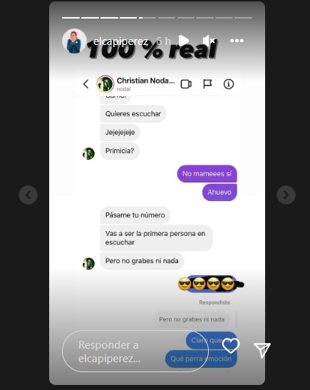 “Fue totalmente real, le di mi número a Nodal y en ese momento me hizo una videollamada. Me acaba de mostrar en exclusiva la rola que acaba de escribir. No es nada como se lo imaginan… no lo ven venir… tiene barras Christian Nodal, es un genio, mi máximo respeto”, expresó el conductor de televisión en sus historias de Instagram.