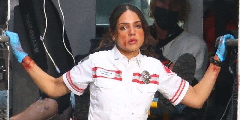Las imágenes publicadas por el portal Page Six se observa una secuencia de imágenes donde se ve a Eiza vestida con uniforme de paramédico, visiblemente molesta e incluso hasta manoteando con el director.