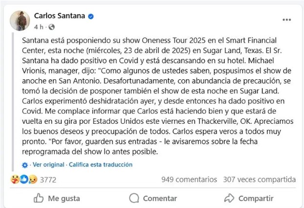 Carlos Santana pospuso su concierto del 23 de abril en el Smart Financial Center de Sugar Land, Texas, luego de dar positivo a COVID-19.