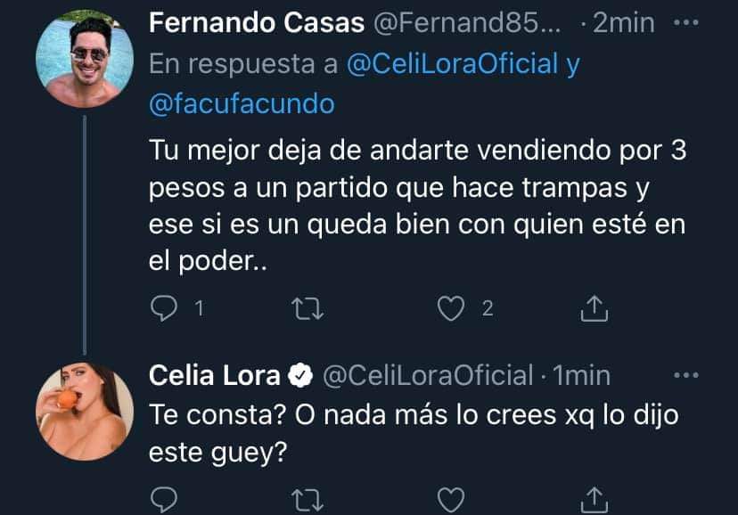Celia Lora fue una de los personalidades que utilizaron sus redes sociales para mostrar su supuesto apoyo al PVEM, por lo que ha sido señalada por muchos, y a raíz de esto empleó su cuenta de Twitter para arremeter contra el conductor
