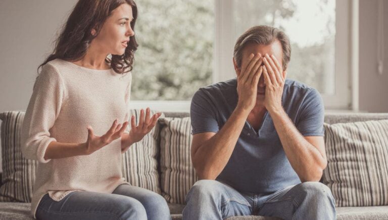 Couple of adults are quarreling while sitting on couch at home, man is covering his face