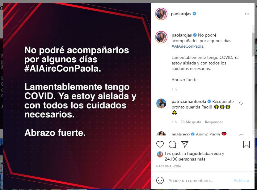 “No podré acompañarlos por algunos días #AlAireConPaola. Lamentablemente tengo Covid. Ya estoy aislada y con todos los cuidados necesarios”, escribió en sus redes sociales.