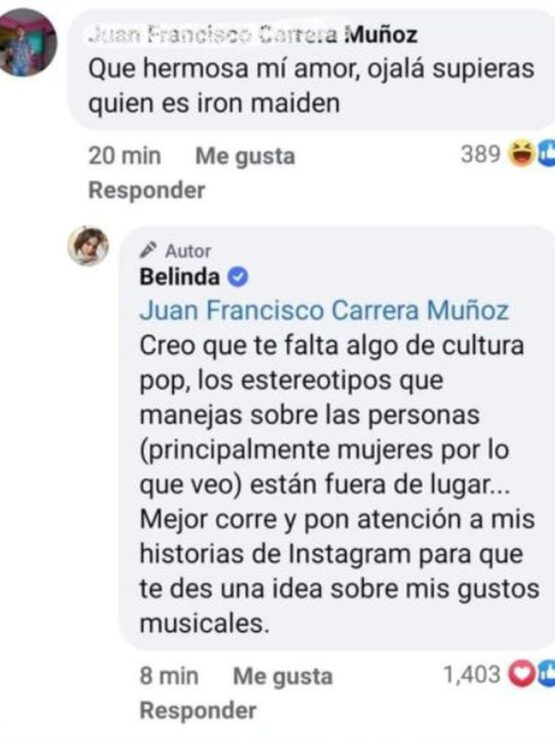 “Qué hermosa, mi amor. Ojalá supieras quién es Iron Maiden”, escribió el usuario, quien probablemente consideró que Belinda no conocía el estilo musical de la banda o quizás asumió que había elegido el atuendo sólo por su apariencia.