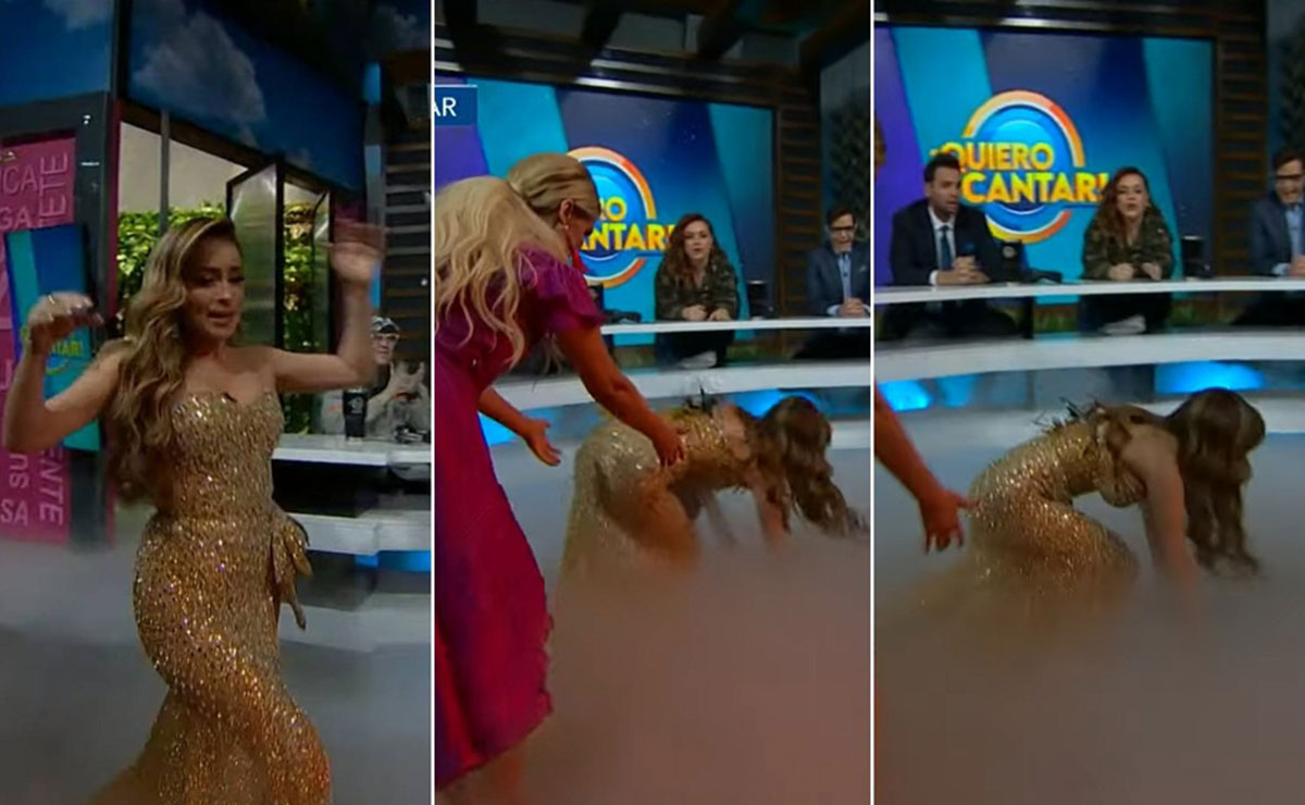 Cynthia tuvo un tremendo tropiezo durante la emisión del reality «Quiero Cantar», pues cuando estaba apoyando a El Capi Pérez en su número musical se resbaló del escenario.