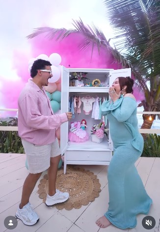 En las imágenes se observa cómo Jesaaelys Ayala y Carlos Olmo comparten la revelación de género de su primer bebé, cabe mencionar que para revelar la noticia los futuros padres abrieron un closet que tenía una ropa de bebé de color rosa, por lo que en ese instante se liberó un humo de color rosa.
