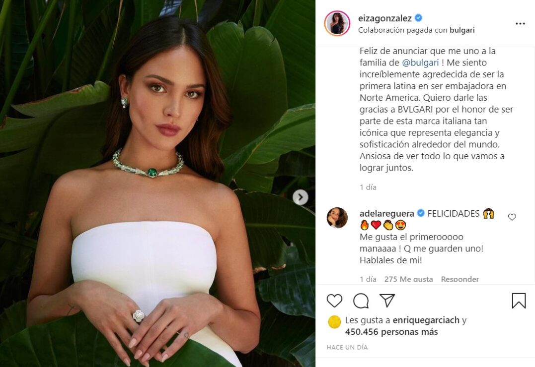 Fue a través de redes sociales que la actriz Eiza dio a conocer la noticia: «Feliz de anunciar que me uno a la familia de @bulgari! Me siento increíblemente agradecida de ser la primera latina en ser embajadora en Norteamérica».