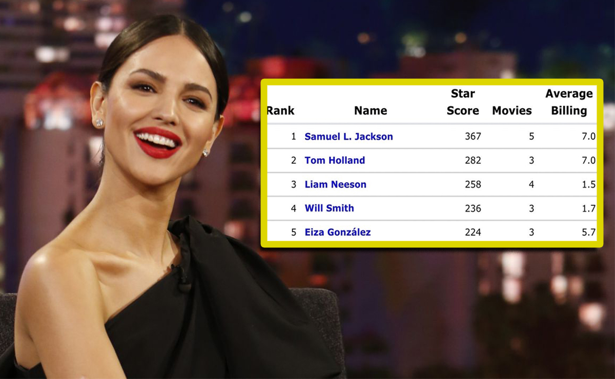 La mexicana, de 31 años, se posiciona en el quinto lugar del top tan sólo detrás de los actores Samuel L. Jackson, Tom Holland, Liam Neeson y Will Smith.