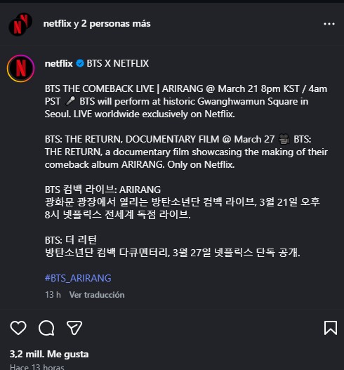 La plataforma anunció que transmitirá en vivo el regreso de la banda con el lanzamiento del disco ARIRANG, el cual estará disponible el próximo 21 de marzo a las 5 de la mañana (hora del centro de México).