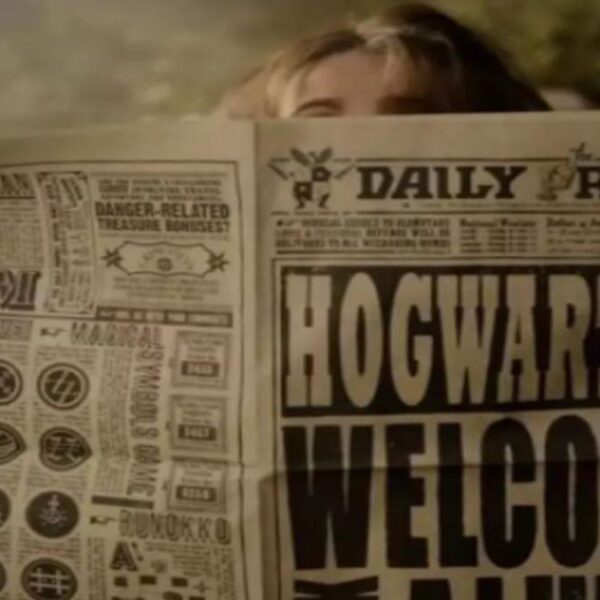 En el avance se observa a Hermione detrás de un periódico de Daily Prophet, mientras espera para subirse al tren 9 y ¾.