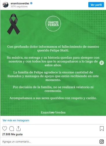 Cabe mencionar que Felipe Staiti falleció tras estar hospitalizado por varios días luego de una fiebre y al parecer una posible hemorragia.