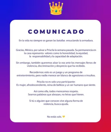En el escrito, que se compartió en el Instagram oficial de Priscila se publicó el mensaje, pidieron un alto a la ola de odio y destacaron que «La casa de los famosos México» es solo un programa de entretenimiento que no debe tomarse tan en serio.