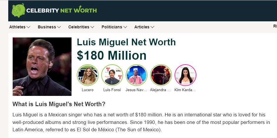 Según el portal, Luis Miguel tiene un patrimonio neto de 180 millones de dólares, lo que en pesos mexicanos equivaldría a 3 mil millones de pesos.
