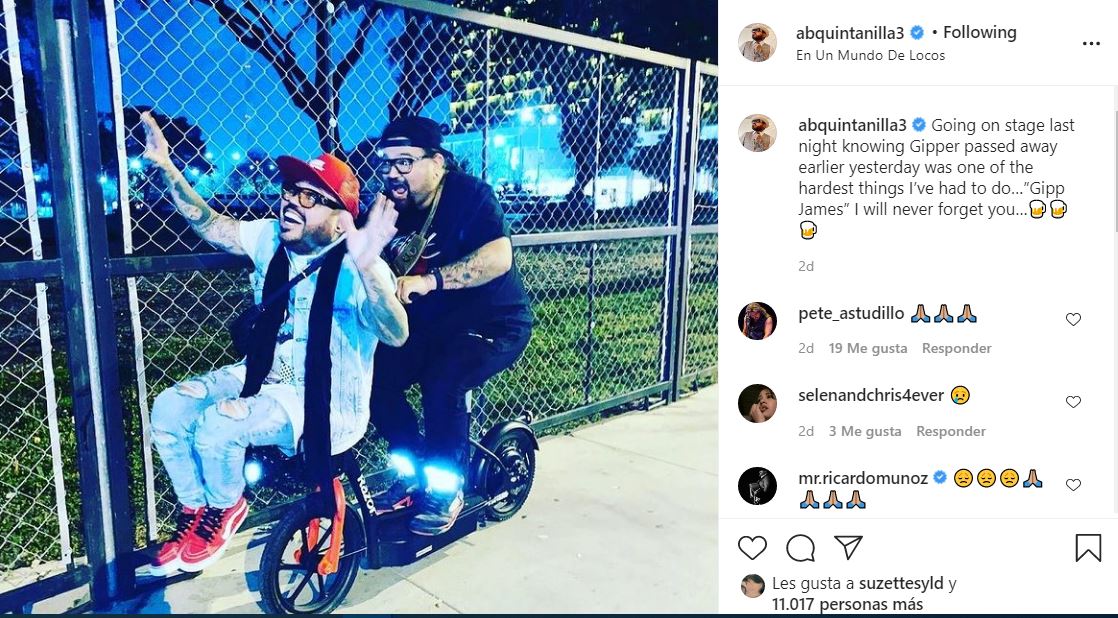«Mientras me estaba vistiendo para subir al escenario, recibí la llamada de que alguien cercano a mi corazón había fallecido. Tantos recuerdos maravillosamente locos y divertidos que tuve en la carretera con Gipper, quien fue mi compañero de cuarto por tantos años. Extrañaré esos buenos tiempos de antes aún más ahora. Gip, gracias por los años de amistad. Vuela con los ángeles», escribió Chris Pérez.