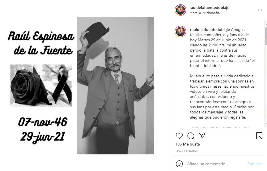 «Mi abuelito pasó su vida dedicado a trabajar, siempre con una sonrisa, en los últimos meses haciendo nuestros videos en vivo y relatando anécdotas, contestando y reencontrándose con sus amigos y fans por este medio», se lee en el mensaje que firma su nieto Axel Espinosa.