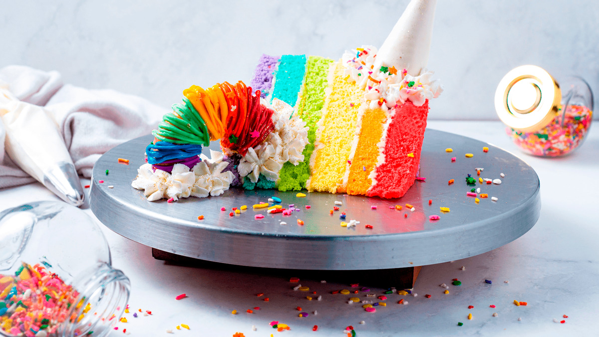 “Pastel de Unicornio” Colorido y delicioso bizcocho de vainilla, bañado con una capa de leche de ron y una cubierta de frosting de queso crema. Junto con dona glaseada en forma de arcoíris, acompañado de chocolate blanco de colores , crema batida y muchas chispas de chocolate (obviamente, también de muchos colores).