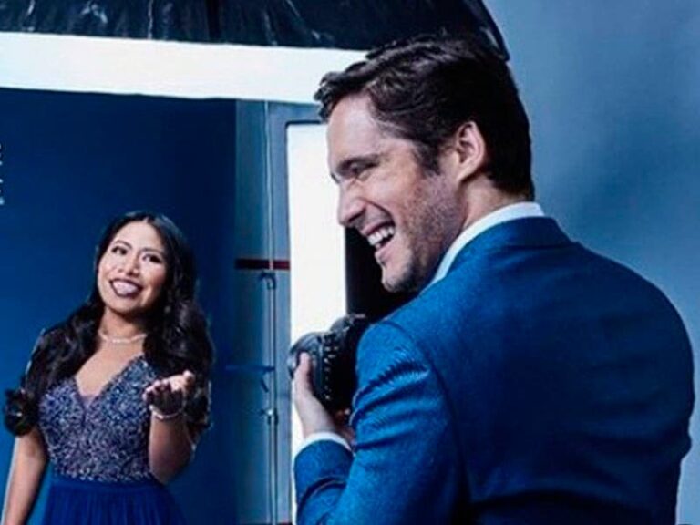 Mientras que el actor le toma las fotos con la cámara que igual está vestido con saco azul y camisa blanca y ambos lucen sonrientes como jugando en la sesión.