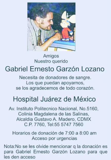 “Amigos, nuestro querido Gabriel Ernesto Garzón Lozano necesita donadores de sangre; quienes puedan apoyarnos, se los agradecemos de todo corazón”, señala el mensaje difundido en redes sociales.