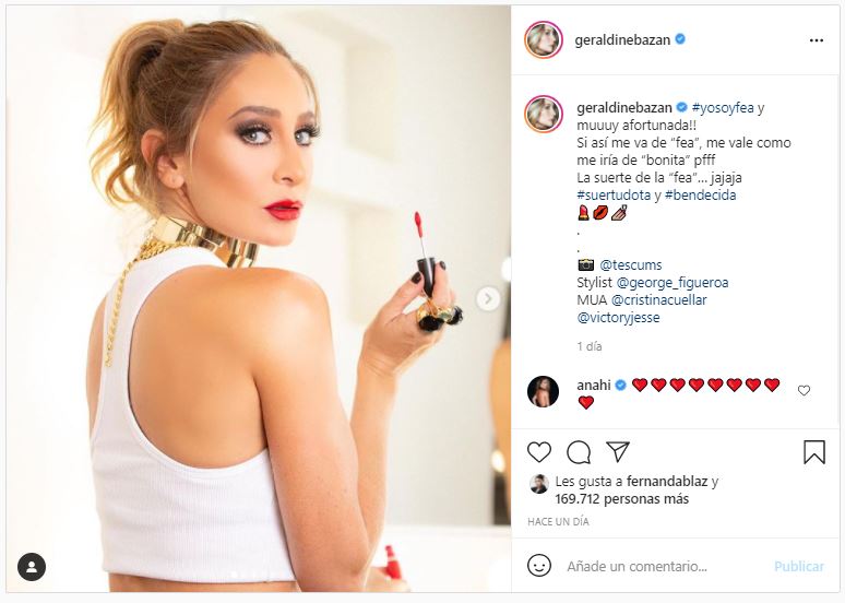 «#yosoyfea y muy afortunada!! Si así me va de ‘fea’, me vale como me iría de ‘bonita’ pfff. La suerte de la “fea” … jajaja #suertudota y #bendecida”, escribió Geraldine Bazán en la publicación.