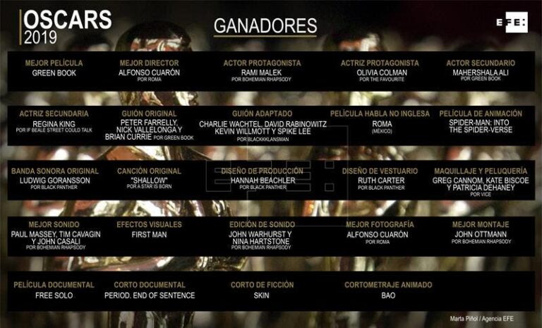 Con tres premios destacaron “Black Panther” (mejor banda sonora original, mejor vestuario y mejor diseño de producción); “Green Book” (mejor película, mejor actor de reparto -Mahershala Ali- y mejor guion original) y “Roma” (mejor película extranjera, mejor director y mejor fotografía, ambos para Cuarón).