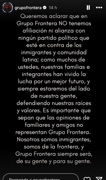 «Queremos aclarar que en Grupo Frontera NO tenemos afiliación ni alianza con ningún partido político que esté en contra de los inmigrantes y comunidad latina», dice el comunicado.