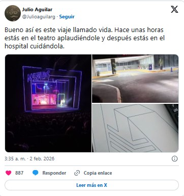 “Bueno, así es este viaje llamado vida. Hace unas horas estás en el teatro aplaudiéndole y después estás en el hospital cuidándola”, escribió Aguilar.