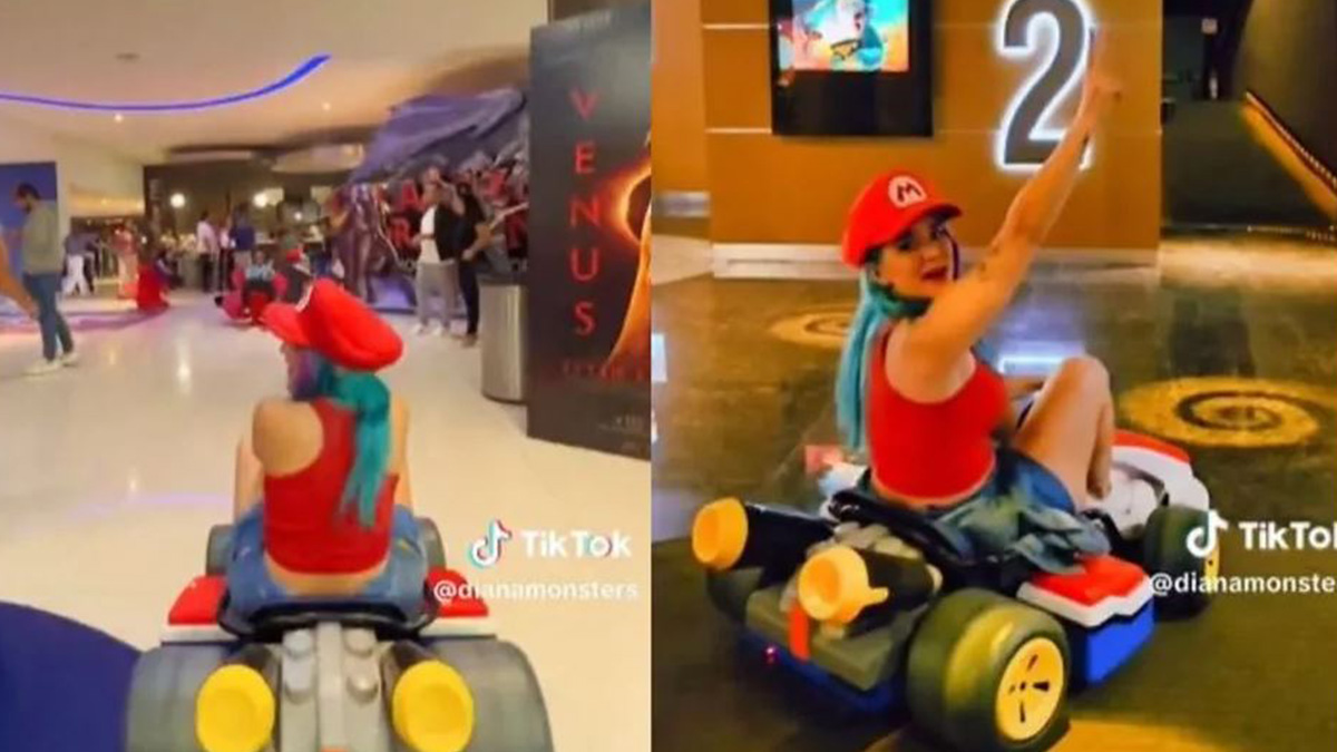 El estreno de la nueva película de “Super Mario Bross” ha causado revuelo entre los internautas, debido a que muchos de los usuarios que han ido a ver la película han optado por ir vestidos en algún cosplay de los personajes, sin embargo la influencer, se subió en un go kart similar al juego “Mario Kart”.