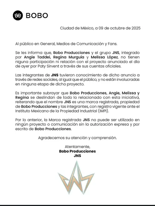 Aunque el comunicado no responde directamente a Paty Sirvent, deja claro que las integrantes de JNS no están involucradas ni han sido invitadas a ningún reencuentro relacionado con la exintegrante fundadora.